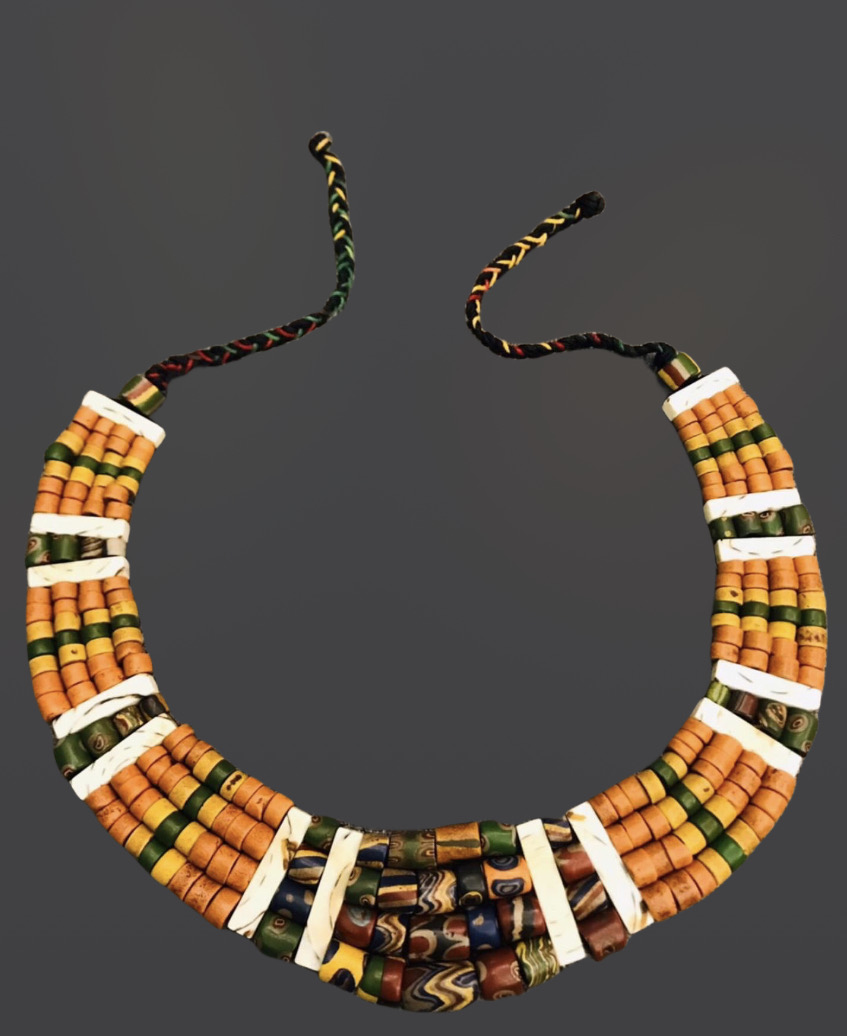 Inspired by Paiwan warrior traditions, this necklace uses faux fangs combined with colored beads and hand-braiding to express strength and status. Each unique piece blends natural materials with cultural symbolism, creating a bold statement accessory.